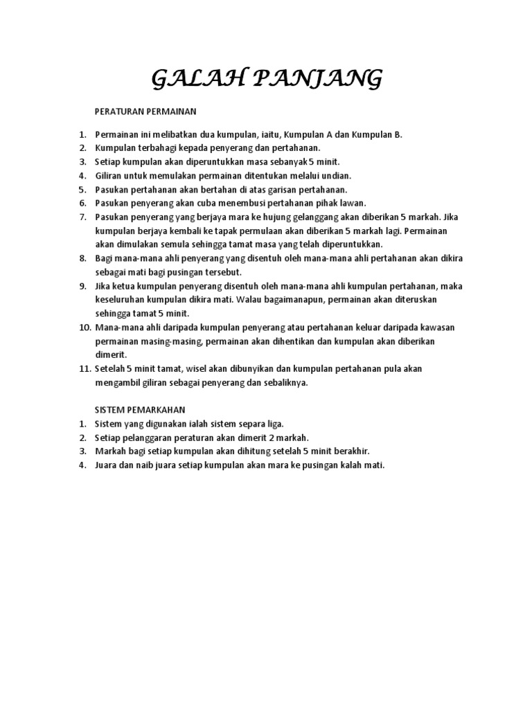 Selalunya satu petak galah panjang berukuran lebih kurang 2 meter x 15. Gelanggang galah panjang di lakar diatas tanah yang. Sekarang ni mungkin dah ramai yang tak tahu cara nak main permainan ni.